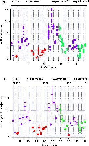 (A) Calculated stiffnesses from AFM force curves on isolated nuclei. The data are grouped for each nucleus. The color code refers to the concentration of injected DNA. Red (asterisk) corresponds to control (no DNA injected), green (circles) to 37 μg/mL, and blue (diamonds) to 110 μg/mL of injected DNA, respectively. (B) Although there is some variability for subsequent measurements of one nucleus, the differences between the different DNA concentrations are obvious and become more pronounced when all measurements of each individual nucleus are averaged. Here the error bars correspond to the SD of each nucleus. There is still some variability between different experiments corresponding to different batches of oocytes. Oocytes within one experiment are all from the same frog. Nevertheless, the degree of expression of lamin A seems to vary to some degree from experiment to experiment and within experiments.