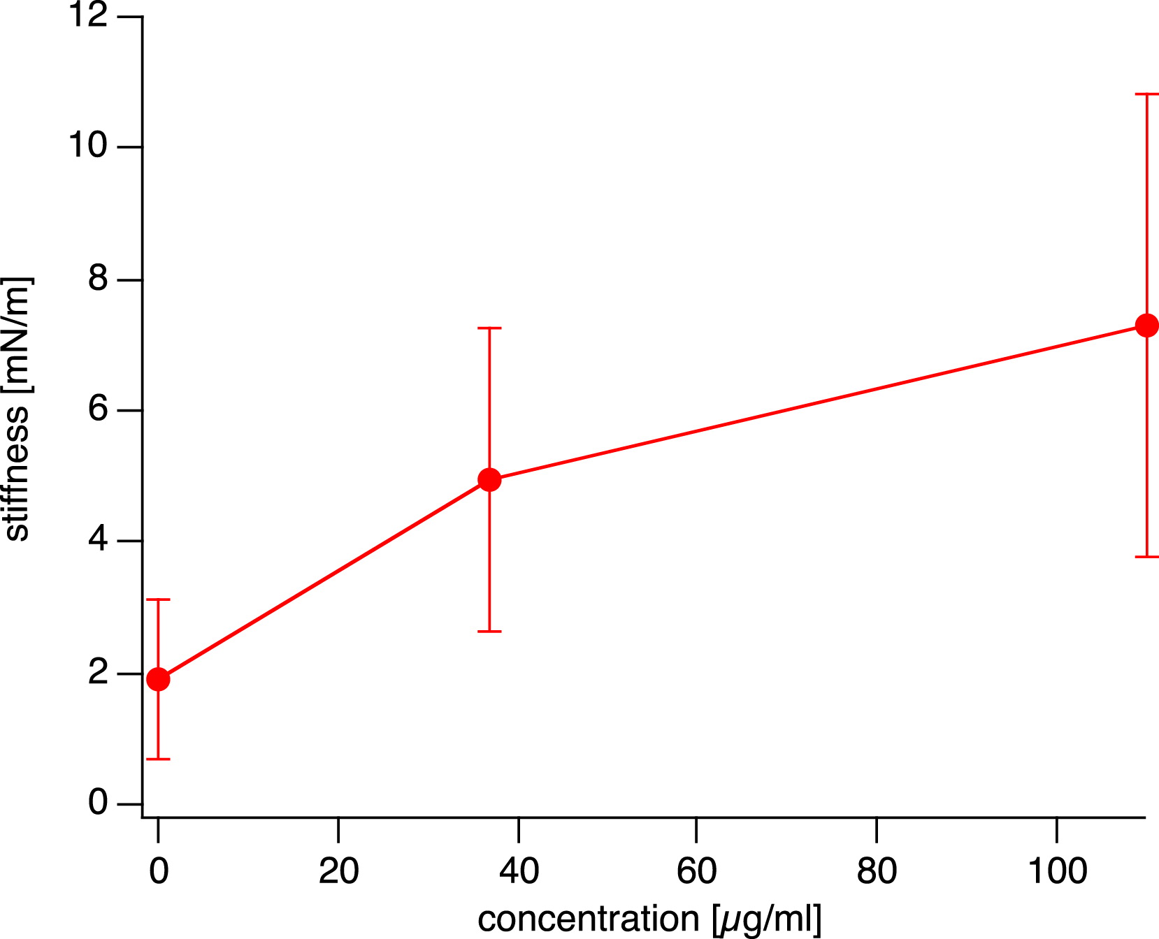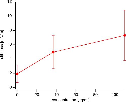 Average stiffness from all measurements as a function of concentration of injected DNA. The difference in stiffness at the three concentrations is highly significant between control and injected samples, and significant between low and high concentrations of injected DNA (see Table 1 for data).