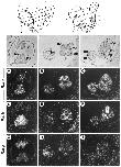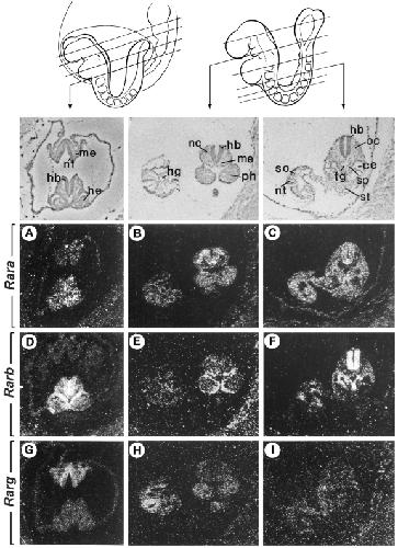 Figure 1. Expression of murine Rar genes in somite-stage embryos.Adjacent histological sections (planes of section as indicated by arrows on the schemes) from two embryos at the 8 somite (A,D,G) and 14 somite (B,C,E,F,H,I) stages were hybridized with 35S-labelled riboprobes for Rara (A-C), Rarb (D-F) and Rarg (G-I). Following emulsion autoradiography, sections are viewed under dark-field illumination showing the signal grains in white. Bright-field views are shown above for histology. Abbreviations: ce, celomic cavity; fg, foregut; hb, hindbrain; he, heart; hg, hindgut; me, mesoderm (primary mesenchyme); nc, neural crest; nf, neural folds; nt, neural tube; oc, occipital somite; ph, first pharyngeal (mandibular) arch; so, somite; sp, splanchnopleure; st, stomach primordium. From (Ruberte et al., 1991). |