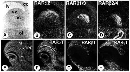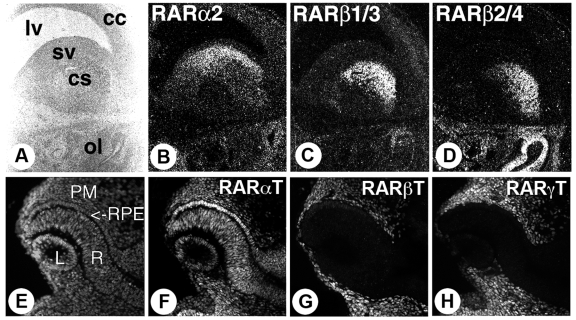 Figure 4. RAR gene and protein expression in the developing brain and eye.(A-D) Comparative ISH of RARα2, RARβ1/3 and RARβ2/4 on neighboring sections of the corpus striatum (lateral ganglionic eminence) of an E13.5 fetal mouse brain. 35S-labelled probes. (E-H) Immunofluorescence detection of RARαT, RARβT and RARγT on serial sections of an E10.5 eye. Abbreviations: cc, cerebral cortex; cs, corpus striatum; L, lens; lv, lateral ventricle; ol, olfactory epithelium; PM, periocular mesenchyme; R, neural retina; RPE, retinal pigmented epithelium; sv, subventricular zone. (A-D) from (Mollard et al., 2000). (E-H) from (Mori et al., 2001). |