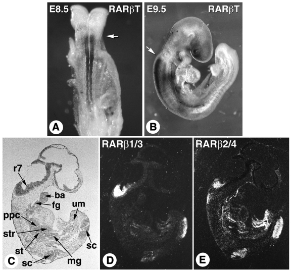 Figure 2. Early expression features of murine Rarb.A,B: Whole-mount ISH of E8.5 (dorsal view) and E9.5 (profile view) embryos hybridized with a digoxigenin-labelled Rarb probe recognizing all isoforms ('Rarb total', RARβT). Arrows point to the sharp expression boundary in the post-otic hindbrain neuroepithelium (r6/7 boundary). C-E: Comparative ISH with 35S-labelled probes specific for RARβ1/3 and RARβ2/4 isoforms, on serial parasagittal sections of an E9.5 embryo. Abbreviations: ba, first branchial arch; fg, foregut; mg, midgut; ppc, peritoneal-pericardial region; r7, rhombomere 7; sc, spinal cord; st, stomach primordium; str, septum transversum; um, umbilical region. (A,B) from (Serpente et al., 2005). (C-E) from (Mollard et al., 2000). |