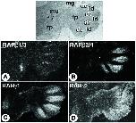 Figure 5. RAR expression in the differentiating limb.Comparative ISH of RARβ1/3, RARβ2/4, RARγ1 and RARγ2 on serial sections through the extremity (footplate) of an E13.5 hindlimb. 35S-labelled probes. Abbreviations: dc, digit precartilaginous condensation; fp, footplate; id, interdigital domain; mg, midgut; mu, muscle; zp, zeugopod (tibia/fibula region). From (Mollard et al., 2000). |