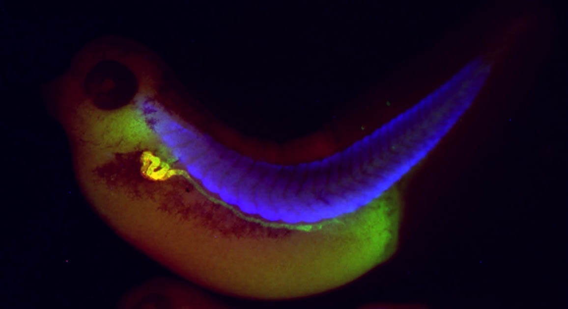 This is an example of one of the figures in the paper, originally from Urban et al., 1996. The images show an embryo processed for two different pronephric genes via fluorescent in situ (atp1a1 and nkcc2 / slc12a1), one shown in red and one in green, Overlap is yellow. The embryo was then counterstained with an anti-somite antibody (12-101) in blue.
