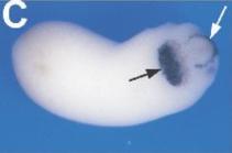 cxcl14 (chemokine (C-X-C motif) ligand 14) is detected in part of the cement gland (black arrows), the dorsal anterior portion of the optic vesicle and the hatching gland (white arrows), in Xenopus embryo, at NF stage 23. |