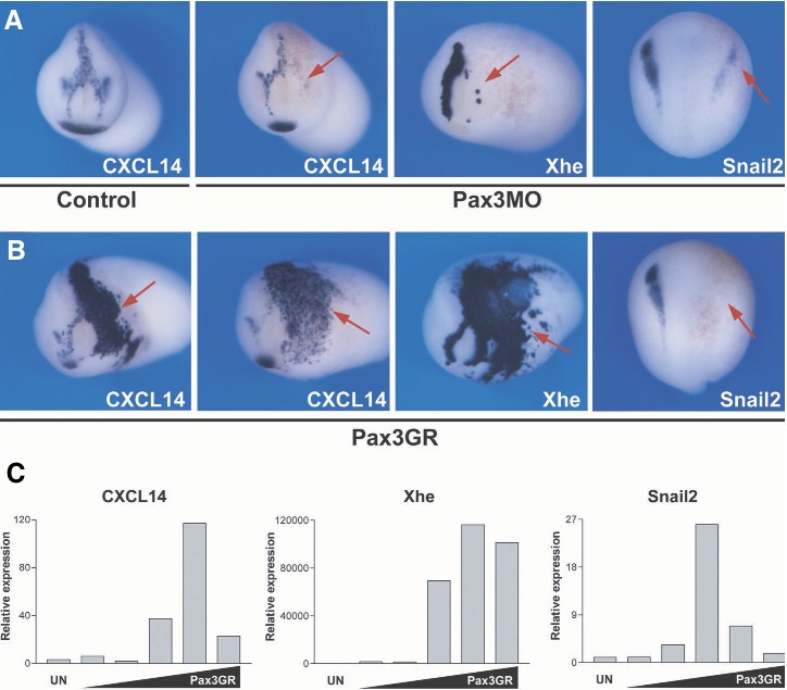 Embryos injected with Pax3 morpholino (Pax3MO; 40ng) exhibit a strong reduction of CXCL14 expression in the hatching gland (arrow). In these Pax3-depleted embryos Snail2 and Xhe expression is also reduced at the neurula and tailbud stages, respectively (arrows). (B) Pax3 overexpression (0.5 ng) in the whole embryo results in a dramatic expansion of CXCL14 and Xhe expression domains at stage 23 (arrows), while Snail2 expression is reduced at stage 15 (arrow). For the embryos hybridized with CXCL14 or Xhe, anterior view is shown, dorsal to top. For Snail2 the embryos are viewed from the dorsal side anterior to top. (C) In animal explants CXCL14 and Xhe are activated by higher doses of Pax3GR mRNA as compared to Snail2. The concentrations of injected Pax3GR mRNA are 0.05 ng, 0.1 ng, 0.25 ng, 0.5 ng and 1ng. Each Real-Time RT-PCR value has been normalized to the level of EF- 1α expression. |