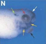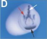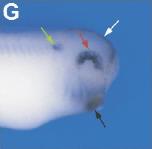 cxcl14 (Chemokine (C-X-C motif) ligand 14) gene expression in Xenopus laevis embryo via in situ hybridization, NF stage 23, anterior view, dorsal up. White arrow indicates expression in the hatching gland, red arrows the dorsal aspect of the optic vesicle and black arrow the cement gland. |