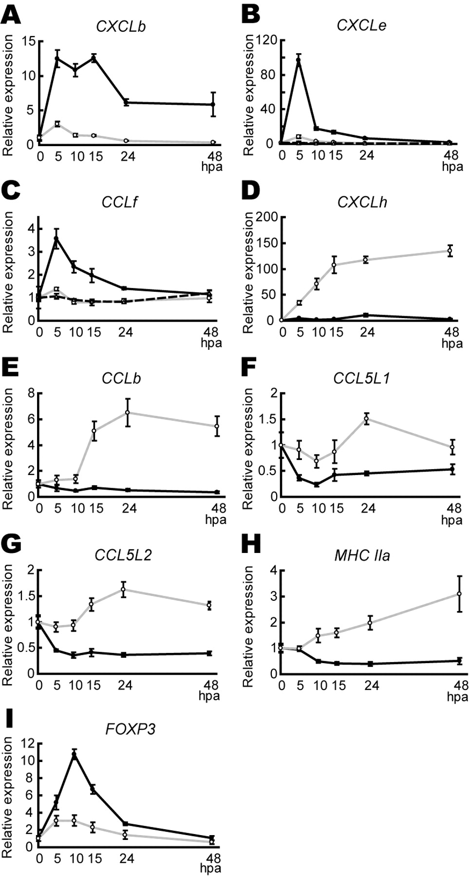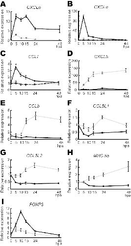 Fig. 2. Expression profiles of immune-related genes in wound stumps differ between the refractory and pre-/post-refractory regeneration periods.(A-I) CXCLb (A), CXCLe (B), CCLf (C), CXCLh (D), CCLb (E), CCL5L1 (F), CCL5L2(G), MHC IIa (H) and FOXP3 (I) expression analysis. The relative amounts of transcripts determined by qRT-PCR were obtained by taking the value at 0 hpa as 1 for each of the pre-refractory (broken line and open triangle), refractory (gray line and open circle) and post-refractory regeneration (black line and solid circle) periods. Transcript levels were first normalized relative to EF-1α transcript levels. |