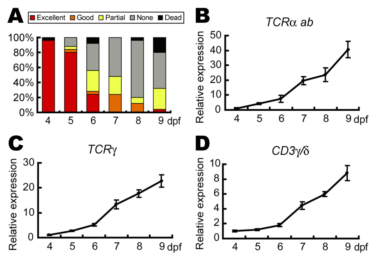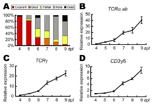Fig. 4. The decrease in regenerative ability correlates with the T cell population development. (A) Frequency of regenerative ability (see key) of 4 to 9 dpf tadpoles (n=25 in each experiment). The numbers of tadpoles classified in each experiment are presented in Table S3 in the supplementary material. (B-D) TCRα (B), TCRγ (C) and CD3γ /δ (D)expression analysis. The relative amounts of transcripts obtained by qRT-PCR were determined by taking the value at 4 dpf as 1, after normalization with ornithine decarboxylase 1. |