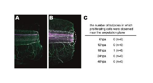 Fig. S2. Proliferating cells appear in the tail wound stump within 18 to 24 hpa. (A,B) Immunostaining using anti-proliferating cell nuclear antigen antibody (purple) and counterstaining of the nuclei (green) of tadpole tails 6 (A) and 24 (B) hpa during the post-refractory regeneration period. Proliferating cells (white) thought to form the blastema appeared near the amputation plane (circled with dashed line). (C) Number of tadpoles in which proliferating cells were observed.