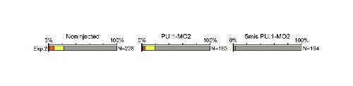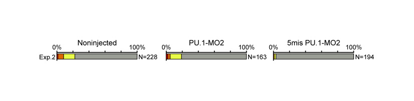 Fig. S4. MO injection has negative effects on regenerative ability. In our MO experiments, MO injection itself seemed to have some negative effects on regenerative ability. For example, in this experiment (experiment 2 using PU.1-MO2), in which the experimental condition was the same as experiment 1 using PU.1-MO2, as presented in Fig. 3K, tadpoles injected with PU.1-MO2 showed significantly higher regenerative ability than tadpoles injected with 5mis PU.1-MO2 (P<0.001, χ2 test). Noninjected tadpoles, however, also showed significantly higher regenerative ability than tadpoles injected with 5mis PU.1-MO2 (P<0.001). The number of tadpoles classified in this experiment is presented in Table S2 in the supplementary material. A similar phenomenon was also observed in experiments 1 and 2 using PU.1-MO1 (Fig. 3J) and experiment 1 using PU.1-MO2 (Fig. 3K), although the extent varied among experiments. In this experiment (experiment 2 using PU.1-MO2), the regenerative ability of PU.1-MO2-injected and noninjected tadpoles was not significantly different (P>0.05), possibly due to a counteraction of the positive effect of PU.1-MO2 by a depletion of normal leukocytes and nonspecific negative effects of the MO itself. The negative effect of the MO injection on regenerative ability was not related to the inhibition of PU.1 because CD45 expression differed significantly between PU.1-MO1/MO2-injected groups and noninjected groups, whereas there was no significant difference between 5mis PU.1-MO1/MO2-injected and noninjected groups (Fig. 3M,L). |