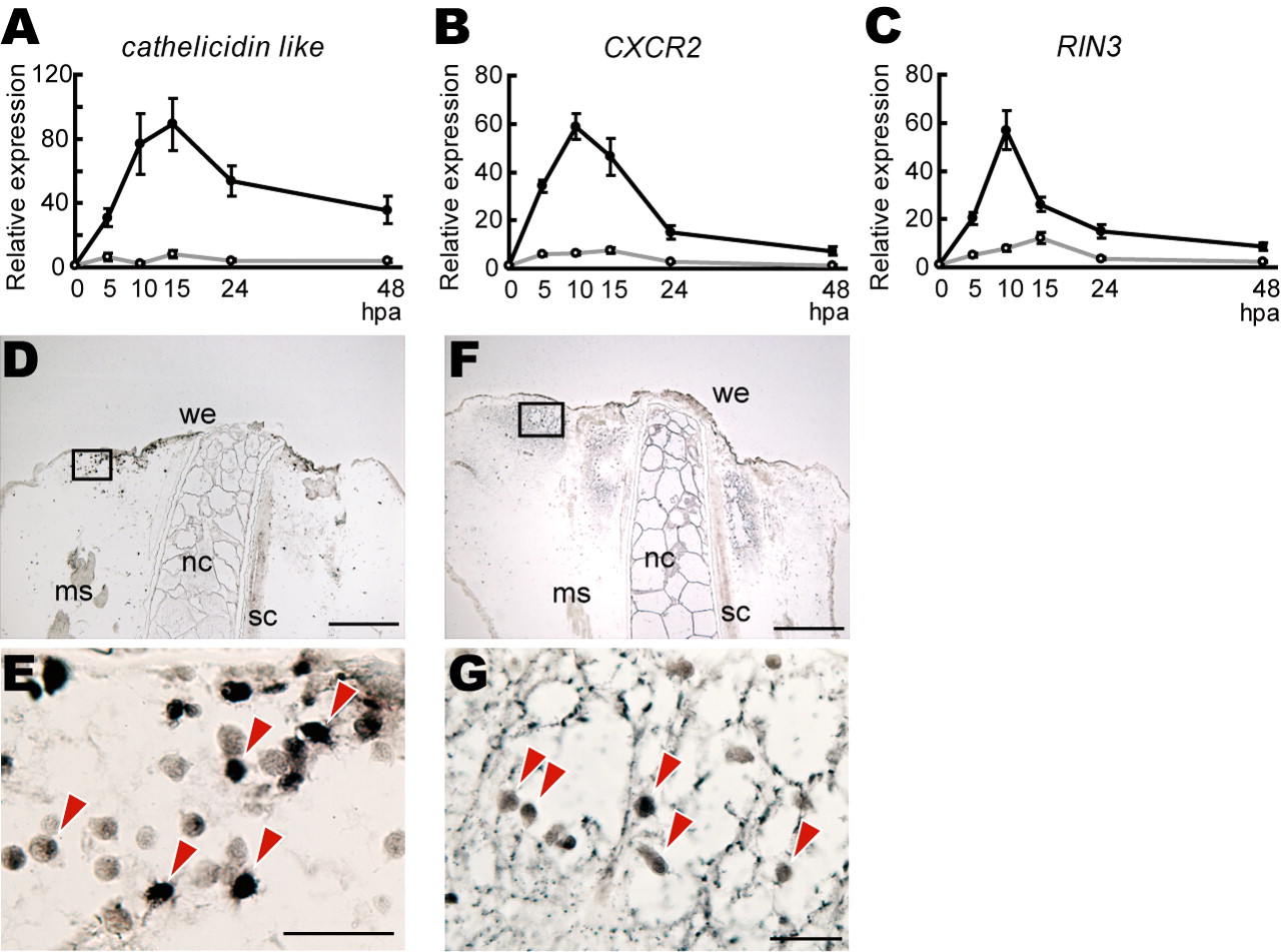 Fig. 1. Expression analysis of genes identified by differential display during the refractory and post-refractory periods. (A-C) cathelicidin-like (A), CXCR2 (B) and RIN3 (C)expression analysis. The relative amounts of transcripts determined by qRT-PCR were obtained by taking the value at 0 hpa as 1 for each refractory period(open circle) and post-refractory regeneration period (solid circle) after normalization relative to elongation factor 1α(EF1α) transcipt levels. (D-G) In situ hybridization for cathelicidin-like (D,E) and CXCR2 (F,G) using the sagittal sections of wound stumps during the post-refractory regeneration period 10 hpa. (E,G) Magnified views of the boxed area in D and F, respectively. Leukocyte-like cells expressing the genes are indicated with arrowheads. ms,muscle; nc, notochord; sc, spinal cord; we, wound epidermis. Scale bars: 300μm in D,F; 30 μm in E,G. |
