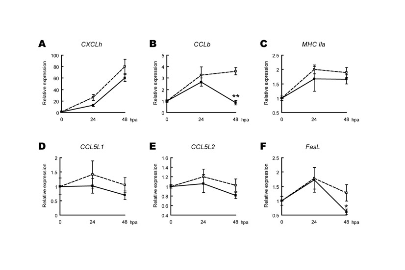 Fig. S3. FK506 antagonizes elevation of immune-related gene expression in amputated Xenopus tadpole tails during the refractory period. (A-E) We examined the effect of FK506 on the expression of five genes that were upregulated during the refractory period: CXCLh, CCLb, CCL5L1, CCL5L2 and MHC class II genes (Fig. 2D-H). In all cases, FK506 treatment decreased the expression of these genes: in particular, CCLb expression was significantly repressed at 48 hpa. (F) Furthermore, we cloned a X. laevis homolog of FASL (GenBank: AB435242), a major effector molecule that is utilized by natural killer cells and activated T cells to destroy target cells in mammals, and found that its expression was also significantly downregulated in FK506-treated groups. The relative amounts of transcripts obtained by qRT-PCR were determined by taking the value at 0 hpa as 1, after normalization using the EF-1α transcripts. Open square and dashed line, dimethyl sulfoxide-treated control groups; solid square and black line, FK506-treated groups. *P<0.05, **P<0.001 (Student�s t-test). |