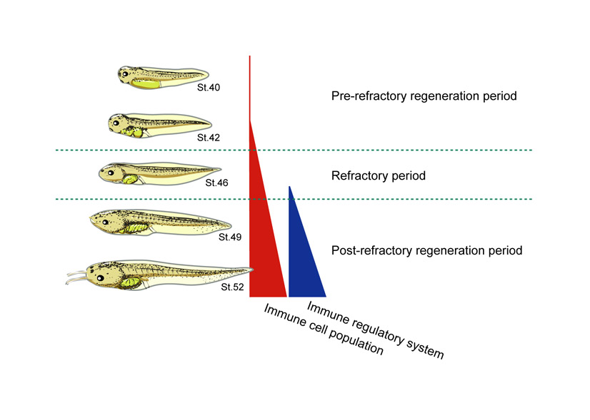 Fig. S5. Thematic model of the developmental stage-dependent regenerative ability in Xenopus tadpole tails. |