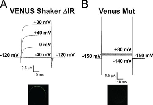 Yang, A hydrophobic element secures S4 voltage sensor in position in resting Shaker K+ channels. 2007, Pubmed , Xenbase