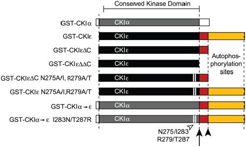 Figure 2. Protein constructs used in this work.CKIα and -ε are shown with their conserved kinase domains in gray and black, respectively (89% similarity, 75% identity). The arrow indicates the position of residue 295 in CKIε, and the non-conserved, charged region of the protein is colored red. The filled arrowhead indicates the position of residue 319, where CKIε is conventionally truncated. The C-terminus contains autophosphorylation sites and is colored yellow. The open arrowhead and white bars indicate the position of residues N275 and R279 (CKIε), and I283 and T287 (CKIα). |