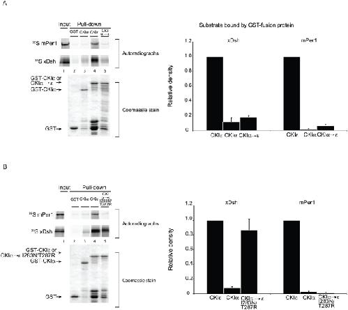 Figure 6. A. Neither xDsh nor mPer1 bind strongly to CKIα→ε.GST, GST-CKIε (partially purified) or GST- CKIα→ε, was bound to glutathione sepharose and incubated with 35S-labeled xDsh or mPer1. (B) GST, GST-CKIε, or GST- CKIα→ε I283N/T287R, was bound to glutathione sepharose and incubated with 35S-labeled xDsh or mPer1. The bar graphs represent quantification of three independent experiments. Values are normalized against the amount of protein bound to GST-CKIε. |