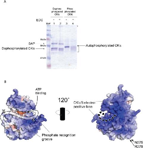 Figure 8. Analysis of the binding of the C-terminal tail.(A) Full-length CKIε was incubated with either SAP or ATP prior to reaction with the EDC crosslinker. Lane 2 shows that there is no change in the apparent molecular weight of dephosphorylated CKIε. In lane 4, there is marked change in the migration of autophosphorylated, crosslinked CKIε (bracketed). Asterisk shows a high molecular weight species that may correspond to SAP-CKIε oligomers (lane 2). (B) Space-filling models of CKIδ are shown. The APBS plugin for PyMol (DeLano Scientific LLC) was used to establish electrostatic potential of solvent exposed atoms. Positively charged areas are shaded blue and correspond to basic regions of the protein; negatively charged regions are red, and correspond to acidic areas. The highly basic groove that has been postulated to be a phosphate recognition region is conservered across the CKI family. The two identified cross-linked residues are indicated with an X. The cartoon line on the left side diagram shows the position of the first 20 amino acids of the tail based on the crosslinking data. The dotted line on the right side shows the proposed extension of the tail onto the backside of the kinase. |