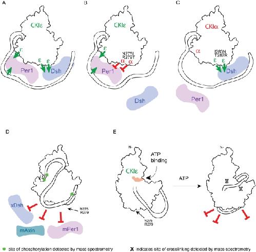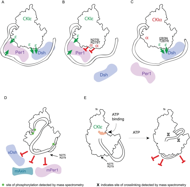 Figure 9. Model of inter- and intra-molecular interactions involving CKIε.Red blocked arrows represent inhibition of binding and green arrows represent positive binding interactions. (A–D) Back face of the kinase. (A) CKIε binds to Dsh and Per using different binding sites. (B) Mutation of CKIε N275 and R279 to the corresponding CKIα identity inhibits Dsh and Per binding; however, the C-terminal tail and at least one other residue in the kinase domain promote Per binding. (C) Changing two residues in CKIα to the CKIε identity along with adding CKIε's C-terminus enables Dsh to bind to CKIα. Per is unable to bind this chimeric kinase. (D) Binding of the autophosphorylated tail to the backside prevents the binding of substrates. Phosphorylated sites detected by mass spectrometry are shown on the tail. (E) View of the front side of the kinase. Left, CKIε's C-terminus is labile when it is not phosphorylated, and CKIε is able to bind to partners. Right, upon incubation with ATP, CKIε autophosphorylates and the C-terminus binds tightly to the back side of the kinase domain. This positions the peptide PEDLDRERREHDREER next to the active site and the phosphate recognition groove. The X's show identified crosslinks between the peptide and the kinase domain. |
