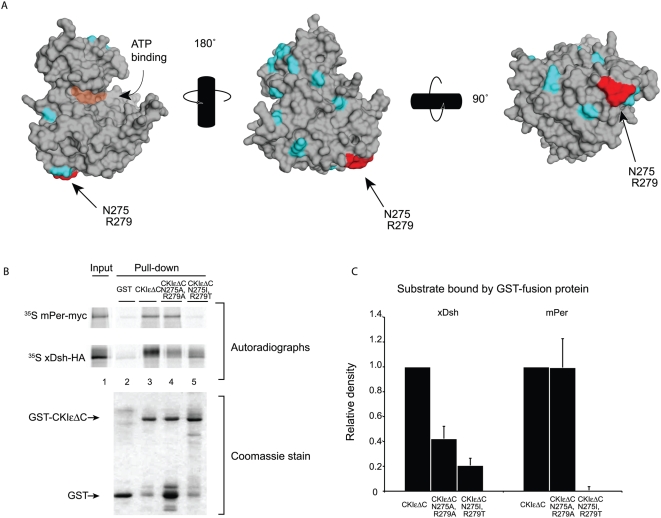 Figure 4. Residues 275 and 279 regulate binding to xDsh and mPer1.(A) Space-filling representation of CKIδ (PDB ID 1CKJ, [50]). Residues shown in cyan and red are conserved between CKIε and CKIδ, but not CKIα. Red residues N275 and R279 are solvent accessible and are chemically distinct in CKIα. Orange shading shows the position of the ATP binding cleft. (B) Binding of 35S-labeled mPer1 and xDsh to GST-CKIεΔC, GST-CKIεΔC N275A/R279A, or GST-CKIεΔC N275I/R279T was performed. (C) Quantification of three independent experiments. Values are normalized against the amount of protein bound by GST-CKIεΔC. |