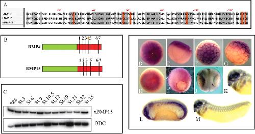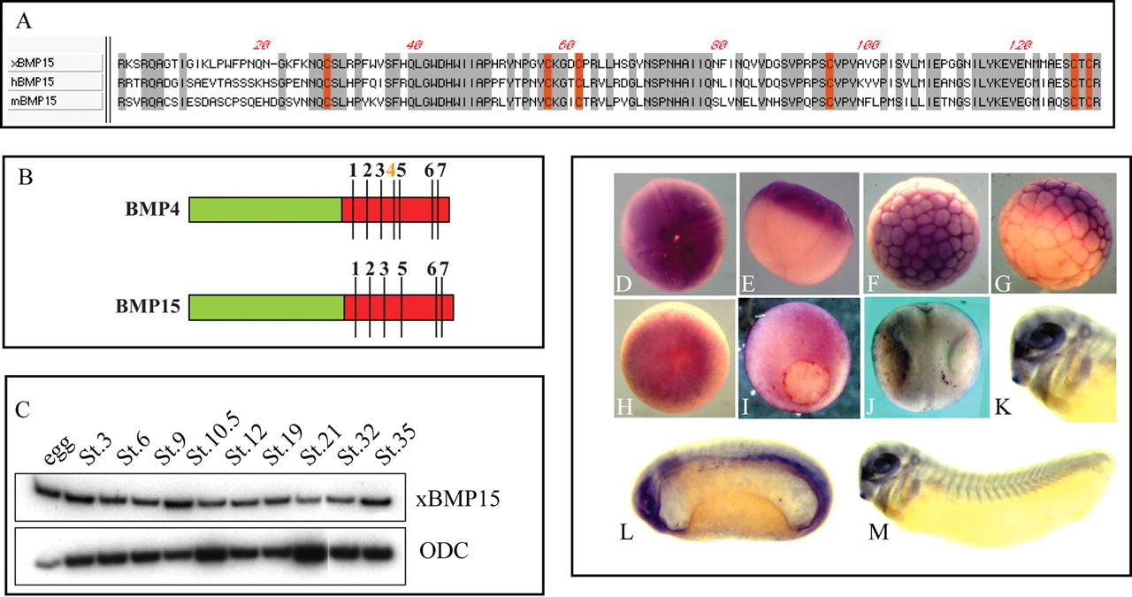 BMP15 expression in Xenopus embryos. A, alignment of the amino acid sequences for the Xenopus (xBMP15) human (hBMP15), and mouse (mBMP15) mature peptide. The mouse and Xenopus proteins show a homology of the 68 and 44%, respectively, with the human protein. B, schematic of a conventional TGFβ ligand, BMP4 (top), highlighting the prodomain (green), the mature domain (red), and the position of the seven signature cysteines. The fourth cysteines in the mature region (highlighted in red) are missing in BMP15 (bottom). C, temporal expression of BMP15 during Xenopus embryonic development, detected by reverse transcription-PCR. BMP15 is expressed maternally in the egg and maintained throughout development. Ornithine decarboxylase (ODC) was used as a loading control. St., stage. DâM, patterns of expression of xBMP15-RNA, as detected by whole-mount in situ hybridization. BMP15 expression is detected in the animal pole region of 4-cell stage embryo (D and E) and maintained in the prospective ectoderm at blastula stage (F and G). Expression then becomes ubiquitous within the ectoderm (H and I). At the neural tube closure, BMP15 is maintained in the nervous system (J and L), and at stage 26 the expression becomes exclusive to the anterior, including sensory organs and hindbrain (l). At tail-bud stage (28), peak expression is maintained in the brain and eyes (K and M). |