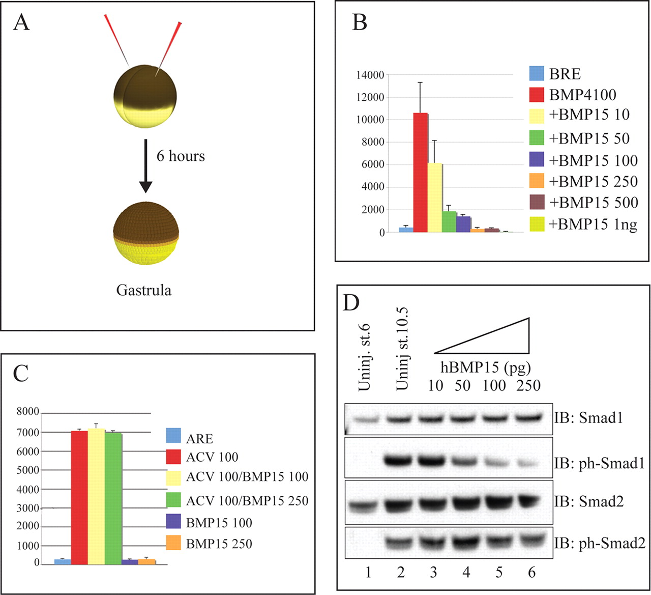 BMP15 inhibits transcriptional response from BRE. A, schematic of experimental design. B, luciferase measurements of total embryo lysates from Xenopus embryos injected with the reporter plasmids BRE-Lux (20 pg). hBMP15 strongly inhibits the activation of the BRE in Xenopus embryos. C, ARE (25 pg) with different doses of hBMP15 mRNA and BMP4 (100 pg), activin (ACV, 100 pg) transcripts. BMP15 has no effect on the ARE. D, increasing amounts of hBMP15 mRNA (10, 50, 100, 250 pg) were injected into one blastomere of two-cell-stage frog embryos, and protein was extracted at the onset of gastrulation (stage 10) from 25 whole embryos/experimental condition. Protein extracts from early cleavage embryos (stage 6) were used as the negative control, and uninjected embryos at stage 10 were used as the positive control. Expression of hBMP15 in embryos strongly decreases Smad1 MH2 domain phosphorylation, demonstrating inhibition of the Smad1/5/8 pathway. BMP15 expression, on the other hand, had no effect on the Smad 2 MH2 phosphorylation, demonstrating the specificity of inhibition within the TGFβ signaling pathway. IB, immunoblot. |