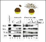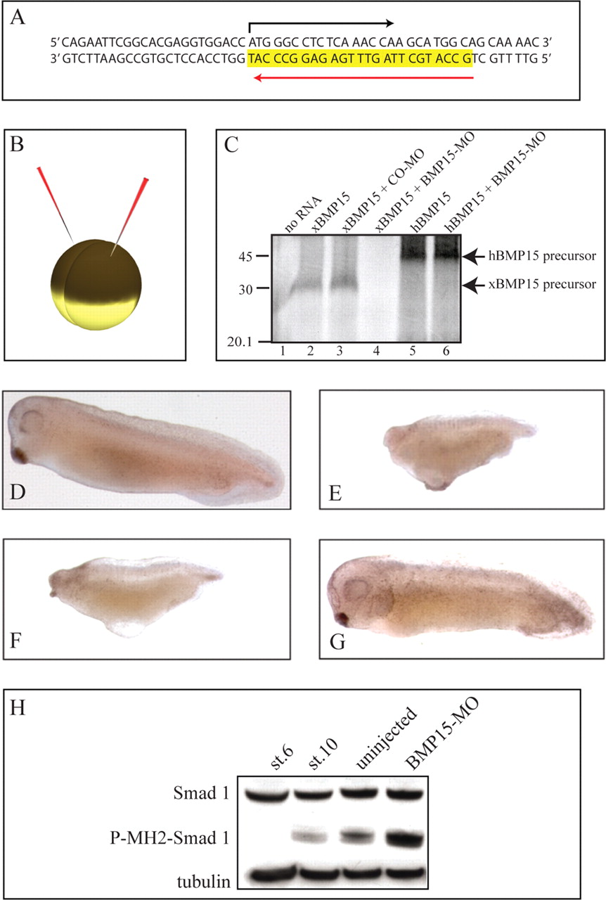 Loss-of-function of BMP15 by morpholino leads to loss of head structures and elevated Smad1 activation in vivo. A, sequence of morpholino designed specifically for interference with the synthesis of the Xenopus BMP15 (xBMP15) protein and used for loss-of-function experiments. Yellow highlights the sequence of the MO that targets the signal sequence of xBMP15 (but not hBMP15). The black arrow indicates the beginning of the open reading frame. B, schematic of injection sites. A total of 10 ng of BMP15-MO was injected in the animal pole of both blastomeres of two-cell-stage embryos, targeting the site of BMP15 expression. Phenotypes were evaluated at tail-bud stages. C, Western blot analysis shows the ability of the MO to block the production of xBMP15 protein (compare lane 3 to lane 4) but not hBMP15 (compare lanes 5 and 6). CO-MO, control morpholino. D, control-scrambled-MO (10 ng)-injected embryos showed normal phenotype. E and F, examples of BMP15-MO-injected embryos displaying anterior defects, with partial-to-complete loss of head structures and in 43%-to-complete ventralization phenotype (n = 105). This phenotype is consistent with excess BMP4 activity because of the removal of its inhibitor BMP15. G, the severe BMP15-MO phenotype can be rescued by co-injection with wild type xBMP15 mRNA. The large majority of the co-injected embryos display normal phenotypes (n = 52/55, 94.5%), providing a stringent control for specificity. 10 ng of BMP15-MO was co-injected with 100 pg of xBMP15 mRNA. H, BMP15-MO induces MH2 domain phosphorylation of Smad1 in Xenopus embryo. BMP15-MO (10 ng total) was injected in the animal pole of both blastomeres of 2-cell-stage embryos. Animal halves explants were dissected at blastula stage, cultured, and lysed at stage 10 and subjected to immunoblotting assay using the antibodies against the indicated targets, including anti-α-tubulin as a loading control. The results show an increase in the MH2 domain phosphorylation of SMAD1 in the BMP15-MO-injected explants (lane 3 and 4). As positive and negative control, lysates from stage (st.) 6 and 10 whole embryos were used. |