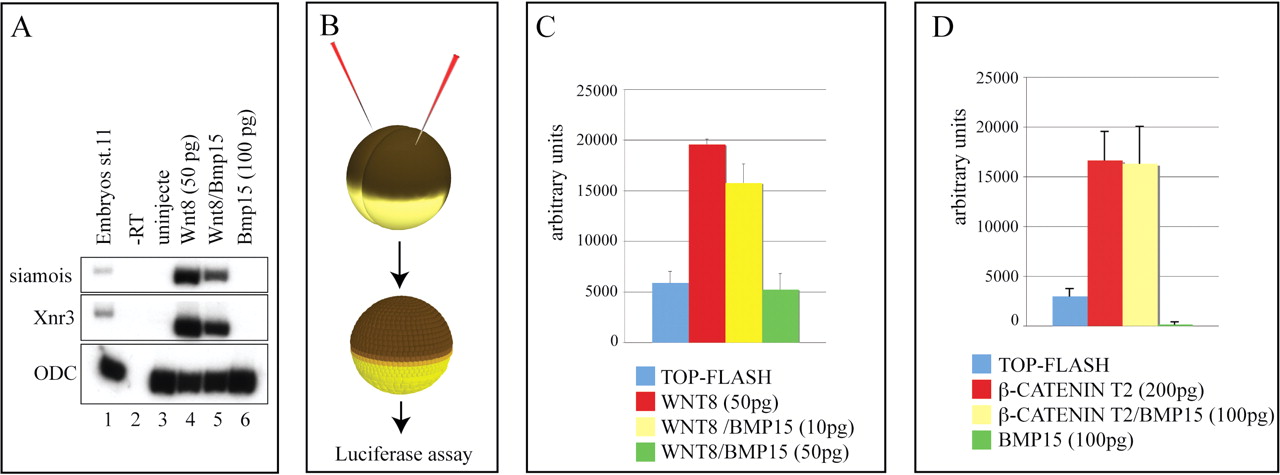 BMP15 inhibits Wnt signaling. A, BMP15 reduces the expression of Wnt responsive genes. Experiments setting are the same as shown in Fig. 3A. Ectodermal explants expressing either 50 pg of Wnt8 or 100 pg of xBMP15 or both were submitted to reverse transcription (RT)-PCR to evaluate the level of expression of Xnr3 and Siamois. st., stage. ODC, ornithine decarboxylase. B, schematic of experimental setting for measurement of Wnt-responsive element TOP-FLASH. Embryos were injected at two cell stages, with 50 pg of Wnt8 or 200 pg of β-catenin T2 alone or together with different concentrations of BMP15. Luciferase assays were performed at early gastrula stage. C, BMP15 inhibits Wnt8-induced transcription from TOP-FLASH. D, BMP15 does not affect the activity of β-catenin T2. This was not because of the ratio of BMP15 to β-catenin, as a 10-fold increase in BMP15 still did not lead to inhibition (data not shown). |