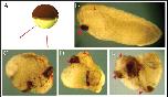 BMP15 induces the formation of ectopic heads. A, schematic shows sites of injections in an eight-cell stage embryo, targeting the two ventral-vegetal blastomeres. B, control uninjected embryo stage 28. C–E, phenotype of embryos injected with 100 pg of hBMP15 mRNA into ventral vegetal blastomeres displaying induction of ectopic heads and cement glands. The red arrows point to the primary head and cement gland of the tail-bud, and green arrows point to the secondary induced ectopic heads. In both cases arrowheads point to the heads, and arrows point to cement glands. |