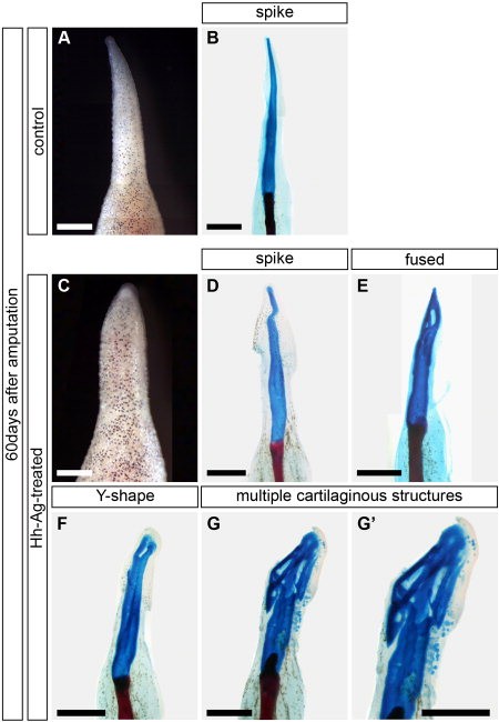Figure 2. Gross morphology and skeletal phenotype at 60 days after amputation. A,B: In the control regenerate, there was neither branching nor joints. CâGâ²: Regenerates treated with Hh-Ag (C) were wider than control regenerates (A) in gross morphology. Specimens formed spikes (D, n = 4/29), Y shapes (F, n = 4/29), and fused Y shapes (E, n = 4/29) at distal regions. Approximately 60% (n = 17/29) of the specimens formed multiple cartilage structures (G, Gâ²; higher magnifications of G). All panels are dorsal views. Scale bars = 1 mm.