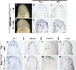 Figure 3. Changes in gene expression induced by Hh signaling activation in the froglet blastema at 14 days after amputation. A,D: The Hh-Ag-treated blastema (D) was larger than the control blastema (A). B,C,E,F: In the control blastema, signals for Shh target genes, Ptc-2 and Gli1, were not detected, whereas these genes were strongly re-expressed in the Hh-Ag-treated blastema. G-N: Signals for Gli3 (K) and dHAND (L) were detected in the Hh-Ag-treated blastema and their expression patterns were similar to those in the control blastema (Gli3, arrowheads in G; dHAND, H). Stronger expression of Hoxd13 was observed in the distal region of the Hh-Ag-treated blastema (M), but expression was weak in the control blastema (arrowheads in I). Tbx2 expression was slightly detected in both the control blastema (arrowheads in J) and Hh-Ag-treated blastema (arrowheads in N). All sections are transverse sections, and the anterior side is on the left of all panels. Scale bars = 200 mu m.