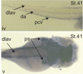 dlav: dorsal longitudinal anastomosing vessel ; da: dorsal aorta; pcv: posterio cardinal vein, ps: pronephric sinus. |