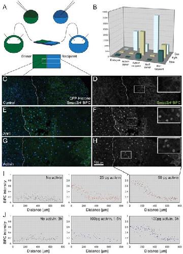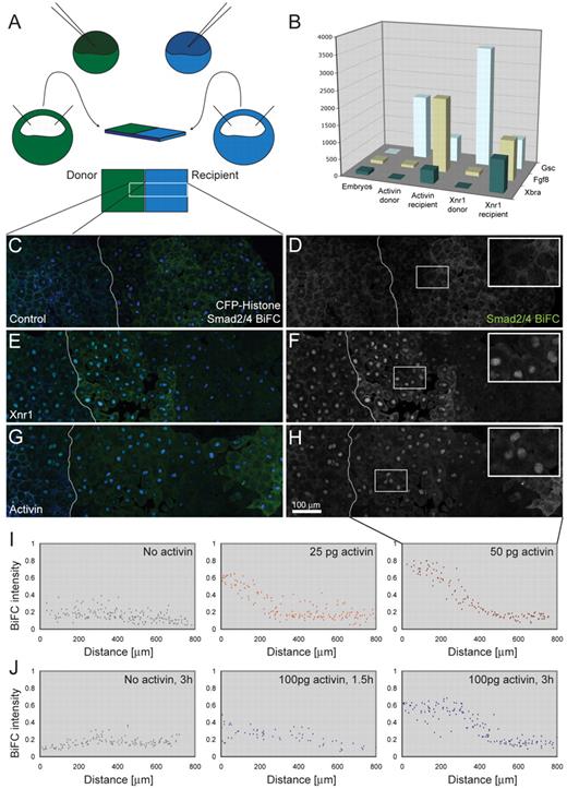 Fig. 3. Long-range induction of Smad2/4-BiFC signalling in Xenopusanimal pole regions. (A) Diagram showing the experimental design. Embryos at the 1-cell stage were injected with RNA encoding cell lineage markers together with RNA encoding Smad2/4-BiFC. The embryo depicted in green was also injected with RNA encoding activin or Xnr1. Animal pole regions were dissected at the late blastula stage and juxtaposed on fibronectin-coated glass-bottomed dishes for imaging, as shown. (B) Animal pole regions prepared as shown in A were cultured for 4 hours and then dissected apart before RNA extraction and quantitative RT-PCR analysis for the expression of Gsc, Fgf8 and Xbra. This experiment was carried out once using activin as an inducer and four times using Xnr1. Note that both activin and Xnr1 are able to induce the expression of all three genes in `recipient'tissue. (C-H) Images of conjugates corresponding to the region outlined in A (n=3). White lines represent the border between two explants. Images are montages created from three fields of view. (C) Control explants expressing CFP-GPI membrane marker and CFP-histoneH2B chromatin marker (both in blue) together with Smad2/4-BiFC constructs (green). In the absence of activin or Xnr1, levels of BiFC fluorescence do not rise above background(Saka et al., 2007). (E) Image of a conjugate identical to that in C, except that the left-hand animal pole region also expresses Xnr1. Note the activation of nuclear Smad2/4-BiFC in the right-hand animal pole region. (G) Image of a conjugate identical to that in C, except that the left-hand animal pole region also expresses activin.(D,F,H) Smad2/4-BiFC fluorescence of sample shown in C,E and G, respectively. Insets represent magnification of outlined areas. Note the activation of nuclear Smad2/4-BiFC in the right-hand animal pole region. (I)Measurements of nuclear BiFC fluorescence intensity relative to CFP-histoneH2B in recipient (right-hand) animal pole regions only. The first graph shows a negative control, the second an experiment in which animal pole regions were derived from an embryo injected with 25 pg activin RNA, and the third an experiment using 50 pg activin RNA. The left side of the graph represents the side of the explant closest to the source of ligand. Quantitation was performed with Volocity software, selecting all nuclei by automatic choice of fluorescence threshold and normalising to CFP-histoneH2B (n=5).(J) Measurements of BiFC fluorescence intensity in recipient(right-hand) animal pole regions at different times after juxtaposition of responding tissue with animal pole regions derived from an embryo injected with no activin (control) or 100 pg activin RNA. Note that a response is visible within 1.5 hours (compare with images in Fig. S4F-H in the supplementary material) (n=2). |