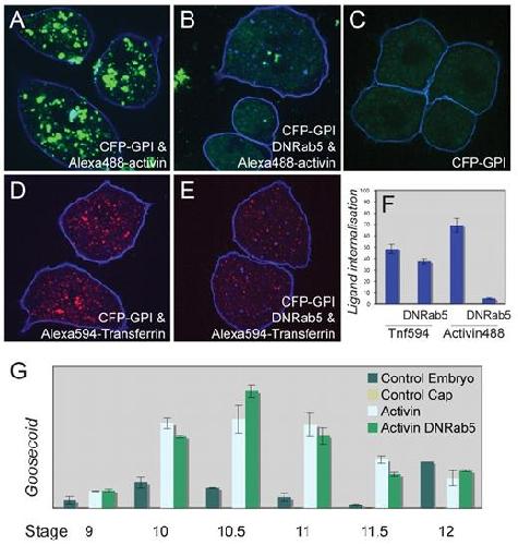 Fig. 7. Inhibition of endocytosis by Rab5S43N does not prevent gene induction in response to activin. (A) Animal pole blastomeres derived at the late blastula stage from an embryo previously injected with RNA encoding lactate dehydrogenase (Ldh; control RNA) and then cultured in the presence of Alexa488-activin. Note the internalised fluorescent activin.(B) Animal pole blastomeres derived at the late blastula stage from embryos previously injected with RNA encoding Rab5S43N (DNRab5) and then cultured in the presence of Alexa488-activin as in A. Note the strong inhibition of internalisation of labelled activin. (C) Control animal pole blastomeres derived as in A but not exposed to Alexa488-activin. Note the yolk autofluorescence. (D) Animal pole blastomeres were derived from embryos injected with RNAs encoding Ldh and the transferrin receptor and were then cultured in the presence of Alexa594-transferrin. Note the internalised transferrin. (E) Animal pole blastomeres were derived from embryos injected with RNAs encoding Rab5S43N and the transferrin receptor and were then cultured in the presence of Alexa594-transferrin. Note the slight inhibition of internalisation of fluorescent transferrin. All embryos in A-E were also injected with RNA encoding the CFP-GPI membrane marker(blue). (F) Quantitation of experiments illustrated in A-E. (G)Expression of Gsc in whole embryos and in animal pole regions treated as indicated and analysed by real-time quantitative PCR at the indicated stages (n=2). Other target genes are shown in Fig. S4A,B in the supplementary material (n=2). Bars represent standard errors of technical replicates. Three additional experiments of this sort were performed in which gene expression analysis was carried out at a single time point;these gave similar results. |