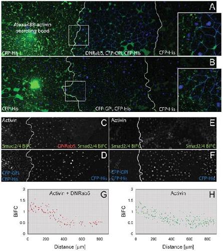 Fig. 8. Effect of Rab5S43N on activin passage and long-range signalling. (A) Three juxtaposed animal pole regions with white lines representing borders between explants. A bead previously soaked in Alexa488-activin was implanted in the left-hand animal cap and the middle section expressed both CFP-GPI and Rab5S43N. All three explants expressed CFP-histoneH2B. Note the extracellular Alexa488-activin in the middle section at a distance from the bead (n=7). (B) Control for A in which the middle section does not express Rab5S43N. Images on right represent enlargements of outlined areas. (C-F) Three juxtaposed animal pole regions in which all tissues expressed Smad2/4-BiFC reagents and CFP-histoneH2B, and the left-hand animal cap expressed activin and CFP-GPI (n=9). In C and D the centre and right-hand animal pole regions expressed Rab5S43N. (C,E) Fluorescence derived from Smad2/4-BiFC. Note the long-range signalling and activation of Smad2/4-BiFC even in the presence of Rab5S43N. (D,F) CFP-histoneH2B fluorescence to reveal nuclei. (G,H) Quantitation of Smad2/4-BiFC fluorescence normalised to CFP-histoneH2B (as described in Fig. 3) in the samples illustrated in C,D (G) and E,F (H) (n=3). |