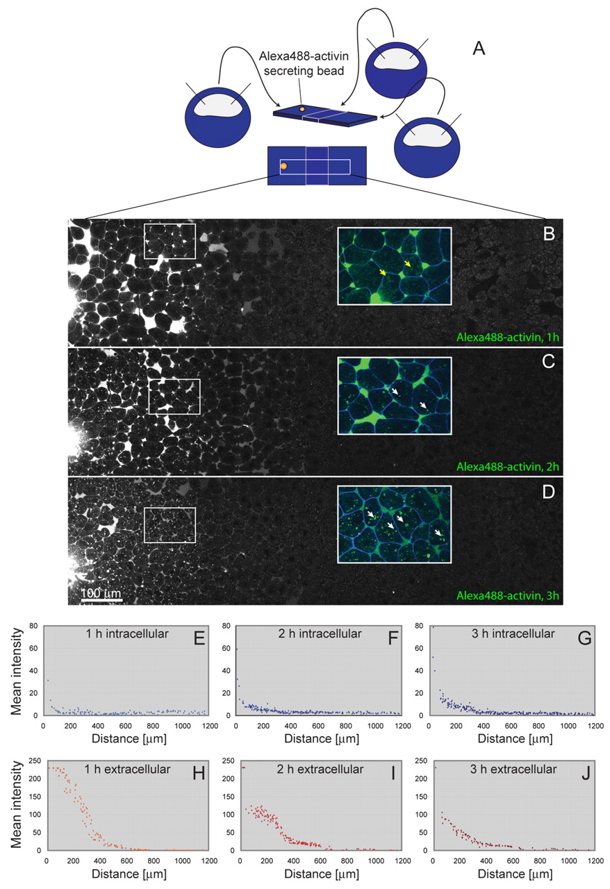 Fig. 2. Long-range signalling by Alexa488-activin. (A) Diagram showing the experimental design. Embryos were injected with RNAs encoding the indicated markers at the 1-cell stage and animal pole regions were dissected at late blastula stage 9 and positioned next to each other on a fibronectin-coated glass-bottomed dish. After allowing time to heal, an Alexa488-activin-soaked bead was placed in the middle of the left-hand animal pole region and conjugates were cultured for 1 (B), 2 (C) or 3 (D) hours before imaging. (B-D) Images of conjugates corresponding to the region outlined in A, with Alexa488-activin being secreted from the bead on the left. Each image is a montage created from four separate pictures and shows Alexa488-activin signal only (n=8). Note the large amounts of extracellular Alexa488-activin in B and C (1-2 hours), and increasing amounts of intracellular fluorescence in C and D (2-3 hours). Insets represent enlargements from the outlined areas, with membrane marker CFP-GPI in blue and Alexa488-activin in green. Yellow arrows in B indicate weak autofluorescence derived from yolk; white arrows in C and D indicate intracellular Alexa488-activin aggregates. (E-J) Quantitation of levels of Alexa488-activin at 1 hour (E,H), 2 hours (F,I) and 3 hours (G,J) in extracellular space (H-J) and intracellularly (E-G). This experiment was carried out four times, with similar results each time. Fluorescence was quantified with Volocity software as a mean of random manually drawn regions of interest (ROIs), defined as intracellular or extracellular relative to the coexpressed membrane marker CFP-GPI. Between 93 and 225 ROIs were counted for each graph, with the area studied representing 1200 μm. The total quantified area represents the 1200 μm-wide clippings shown in B-D. Note that elevated levels of extracellular fluorescence, at positions remote from the bead, are detected before one can detect elevated levels of intracellular fluorescence. |