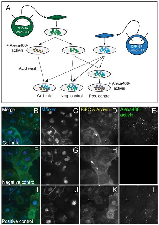 Fig. 5 Mixed-cell assay for the analysis of activin signalling transfer.(A) Xenopus embryos at the 1-cell stage were injected with RNA encoding Smad2/4-BiFC constructs and either CFP-histoneH2B (green embryo) or CFP-GPI (blue embryo) as lineage markers. Animal pole regions were excised at the late blastula stage and dissociated into single cell suspensions. One third of the cells marked with CFP-histoneH2B were treated for 1 hour with Alexa488-activin and then washed four times, including a 30-second acidic wash to remove surface-bound protein. A similar number of cells from the same population was not treated with Alexa488-activin but was otherwise treated identically (including the wash steps). Both groups of cells were mixed with dissociated blastomeres derived from embryos labelled with CFP-GPI and CFP-histoneH2B and then allowed to adhere before being transferred to fibronectin-coated glass-bottomed dishes. One portion of the `control' mix, in which neither population of cells had been previously treated with activin,was exposed to Alexa488-activin for 1 hour to confirm that cells remained healthy and could still respond to induction. (B-L) Confocal images of the experiments described in A. (B,F,I) Merged images showing CFP markers in blue and Smad2/4-BiFC and Alexa488-activin in green. (C,G,J) CFP markers viewed at an excitation wavelength of 440 nm. (D,H,K) Smad2/4-BiFC and Alexa488-activin are visible at an excitation wavelength of 514 nm. Note that Alexa488-activin and Smad2/4-BiFC are not detectable in untreated cells that are positioned adjacent to cells treated with labelled activin (D). Rather,levels of nuclear fluorescence resemble those in control samples (H), where a weak signal is present only in the cytoplasm and on the nuclear membrane(Saka et al., 2007). Note the Smad2/4-BiFC aggregates in D and H (arrows). Treatment of control samples with Alexa488-activin causes nuclear Smad2/4-BiFC accumulation and one can detect labelled activin within cells (K). (E,L) Excitation at a wavelength of 488 nm allows one to visualise Alexa488-activin alone. Note that labelled activin cannot be passed from cell to cell. This experiment was carried out four times, with similar results each time. |