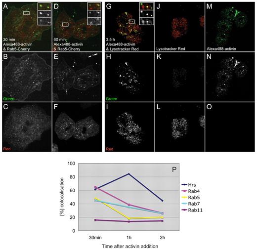 Fig. 6. Colocalisation studies using Alexa488-activin. (A-F) Confocal images of dissociated Xenopus animal pole blastomeres incubated with Alexa488-activin (green). Early endosomes are marked by the expression of a Rab5-Cherry construct (red). (A-C) Images acquired 30 minutes after a 10-minute treatment with labelled activin. (D-F) Images acquired 60 minutes after a 10-minute activin treatment. (G-I) Confocal images of dissociated animal cap cells treated with Alexa488-activin (green) and counterstained with LysoTracker Red. Images were acquired 3.5 hours after a 10-minute treatment with labelled activin. Insets in A,D,G represent the area outlined in the main part of the image, and show a merged image (top) and images taken using green (middle) and red (lower) fluorescence filters separately. (J-L) Control cells not exposed to Alexa488-activin and counterstained with LysoTracker Red. (M-O) Cells treated with Alexa488-activin only. Images in B,E,H,K,M were acquired using 488 nm excitation and a narrow 521-531 nm filter for green fluorescence emission to reduce background. Images in C,F,I,L,O were acquired using 561 nm excitation and a narrow 601-613 nm filter for red fluorescence emission. All cells were seeded on glass-bottomed dishes that had been coated previously with E-cadherin. (P) Quantitation of colocalisation of Alexa488-activin with the indicated fluorescent markers. An average of ten cells was counted for each point, with each cell containing at least ten aggregates of Alexa488-activin. |