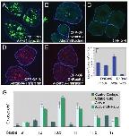 Fig. 1 Alexa488-activin internalisation in dissociated animal cap cells.(A) Real-time RT-PCR analysis of dissected animal pole tissue treated with the indicated amounts of unlabelled activin or Alexa488-activin and cultured to the equivalent of the early gastrula stage. Bars indicate induction of Gsc. Note that unlabelled activin is approximately twice as effective as Alexa488-activin in inducing Gsc. This experiment was carried out four times, with similar results each time. (B-Bâ³)Dissociated animal pole cells at the late blastula stage following incubation in Alexa488-activin for 1 hour before washing. Cells were derived from embryos that had previously been injected with the membrane marker CFP-GPI (blue).(Bâ²) Alexa448 fluorescence alone. (Bâ³) CFP-GPI fluorescence alone. Note Alexa488-activin accumulation at a cell-cell bridge (arrow in B).(C-F) Competition experiment in which cells are treated with Alexa488-activin in the presence of increasing amounts of unlabelled activin.(C) Internalisation of Alexa488-activin in the absence of unlabelled activin.(D) Internalisation of Alexa488-activin in the presence of a 10-fold excess of unlabelled activin. (E) Internalisation of Alexa488-activin in the presence of a 100-fold excess of unlabelled activin. (F) Quantitation of the experiment illustrated in C-E, showing mean numbers of aggregates (spots) of internalised Alexa488-activin. Values are means of 20-30 cells. |