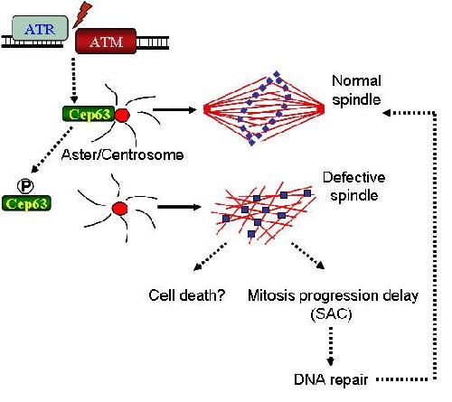 Figure 1. Proposed model: ATM and ATR mediated XCEP63 phosphorylation promotes its removal from centrosome delaying spindle assembly. Depending on the number of DNA breaks this can lead to mitotic progression delay or mitotic cell death.