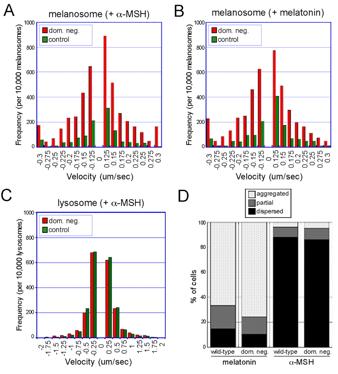Fig.5. Melanosomes move more in the absence of a vimentin IF network. (A,B) The number of moving melanosomes and their speed were elevated in both retrograde (â) and anterograde (+) directions in cells expressing the dominant negative vimentin construct, GFP-vim(1-138) (dom. neg.), when compared with control cells. These increases were evident during both dispersion by α-MSH treatment and melatonin-induced aggregation. (C) In contrast to melanosomes, lysosomal movement was not affected by the expression of GFP-vim(1-138) (dom. neg.) as compared with control cells. Lysosomes were tracked in cells treated with α-MSH to mirror the melanosome dispersion situation. Similar results were obtained in unstimulated cells (not shown). (D) Disruption of the vimentin IF network by overexpression of the dominant negative vimentin (dom. neg.), did not affect the end states of melanosomes in response to melatonin and α-MSH at 60 minutes after hormone treatment. Melanosomes were predominantly aggregated in both transfected and wild-type cells in response to melatonin and dispersed in both cell types in response to α-MSH.