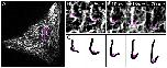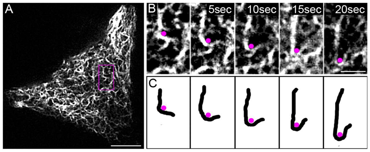 Fig.6. Vimentin filaments undergo dramatic shape changes during melanosome movement. Xenopus melanophores expressing GFP-vimentin were used for live-imaging experiments. These cells were serum starved for 2 hours, followed by treatment with α-MSH to stimulate granule dispersion and then imaged using a spinning disk confocal microscope with 5-second frame intervals. (A) A low magnification image at time point 0 (scale bar: 5 μm). (B) Higher magnification, time-lapse frames show a granule, pseudo-colored purple, moving with the vimentin filament that bends and moves toward the lower left field of view (scale bar: 1 μm; also see supplementary material Movie 1). (C) A cartoon depiction of the relevant filament and granule from B, for easier visualization.