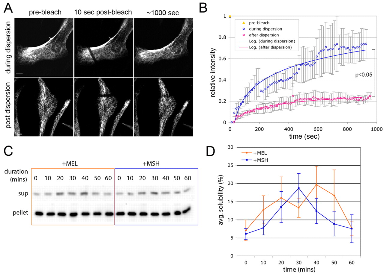 Fig.7. There is a higher fraction of exchangeable and soluble vimentin during hormone-induced melanosome movement than in steady state cells. (A) GFP-vimentin-expressing Xenopus melanophores (stable cell line) were imaged before and during recovery after photobleaching. The fluorescence recovery of cells (treated with α-MSH) during active melanosome dispersion and post-dispersion was compared. Contrast was adjusted in the 1000 second frame to visually normalize for overall loss of fluorescence during imaging. Scale bars: 10 μm. (B) Quantitative analysis of fluorescence recovery after photobleaching, both during (blue) and after (pink) melanosome dispersion. The result suggests a higher fraction of exchangeable vimentin during melanosome dispersion. The values are averages from four cells under each condition. The difference between the average t1/2s between dispersing and fully dispersed cells was statistically significant (P=0.037). Error bars indicate the standard deviation. (C) Western blot analysis shows a transient increase in vimentin solubility in response to melatonin (+MEL) or α-MSH (+MSH) treatment, followed by a decrease to initial levels. Soluble (sup) and pelletable fractions (pellet) from IF-enriched preparations were separated by centrifugation at 12,000 g for 10 minutes (see Materials and Methods). (D) Changes in the percentage of soluble vimentin in response to hormone treatment were quantified from western blots. Averages from three experiments for each treatment are shown (blue, α-MSH; orange, melatonin). The increase in solubility from time 0 to 40 minutes after treatment with melatonin was statistically significant (P=0.02). Similarly, changes in solubility between 0 and 30 minutes after treatment with α-MSH were also statistically significant (P=0.0072). The decrease in solubility between 40 or 30 minutes and 60 minutes after treatment was also significant for both treatments (P=0.018 for melatonin and 0.026 for α-MSH). Error bars indicate the standard deviation.