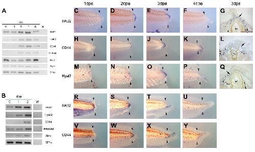 Fig. 1. Transient expression of components of the HA pathway during tail regeneration in Xenopus tadpoles. (A,B) Semi-quantitative RT-PCR analysis of the expression level of HA pathway components during tail regeneration of tadpoles amputated at stage (A) 48/50 and (B) 41/42. The levels of mRNA for HAS2, Hyal-2, CD44, RHAMM, collagen type II (Coll II) and syndecan1 (Syn1) were evaluated using specific primers. EF1α was used as loading control. (C-Y) In situ hybridization analyses of HA pathway components from tadpoles amputated at stage (C-Q) 48/50 and (R-Y) 41/42. Tails from 1 (C,H,M,R,V), 2 (D,I,N,S,W), 3 (E,J,O,T,X) and 4 (F,K,P,U,Y) dpa were processed for in situ hybridization with the indicated riboprobes. (G,L,Q) Sagittal sections of the most posterior part of regenerating tails at 3 dpa. Arrowheads, amputation plane; arrow, mesenchymal cells; NC, notochord. Scale bar: 200 μm. |