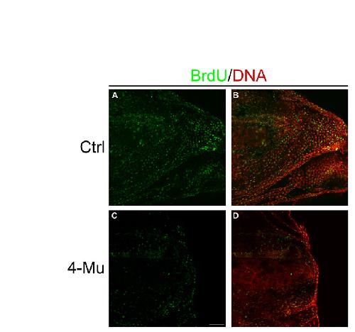 Fig. S3. Effect of 4-Mu in BrdU incorporation. Tadpoles at stage 41/42 were amputated, incubated with 200 µM BrdU during 48 hours, fixed and stained for BrdU (green) and DNA (red). (A,B) Controls and (C,D) tadpoles incubated with 150 µM 4-Mu during 24 hpa. White arrowheads indicate the plane of amputation. Scale bar: 50 µm. |