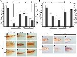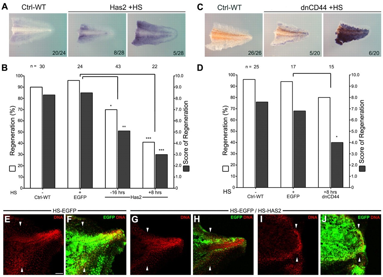 Fig. 4. HAS2 and dnCD44 F0 transgenic tadpoles have reduced levels of tail regeneration. (A-D) HAS2 (A,B) and dnCD44 F0 (C,D) transgenic tadpoles were prepared. (A,C) Levels of transgene expression were evaluated by in situ hybridization in EGFP-positive tails from tadpoles amputated and fixed 16 hours after heat shock. (B,D) Efficiency of regeneration was evaluated and compared to EGFP F0 transgenics that were also heat shocked. White bars, percentage of regeneration; black bars, score of regeneration). The numbers on top of each bar correspond to the number of tadpoles analyzed for each experimental point. All EGFP-positive tadpoles were considered for these experiments. The results shown are representative of three independent experiments. *P<0.05; **P<0.01; ***P<0.001. (E-J) HS-EGFP (E,F) or HS-EGFP/HS-HAS2 (G-J) F0 transgenic tadpoles were prepared and heat shocked 16 hours before amputation; EGFP-positive tadpoles were selected, heat shocked again at 8 hpa and fixed at 2 dpa. Nuclear DNA was stained with TOTO3 (red) and analyzed by confocal microscopy. Panels E,G and I show the red channel (nuclei) and panels F, H, J merge image (green: EGFP). Scale bar: 50μ m. |