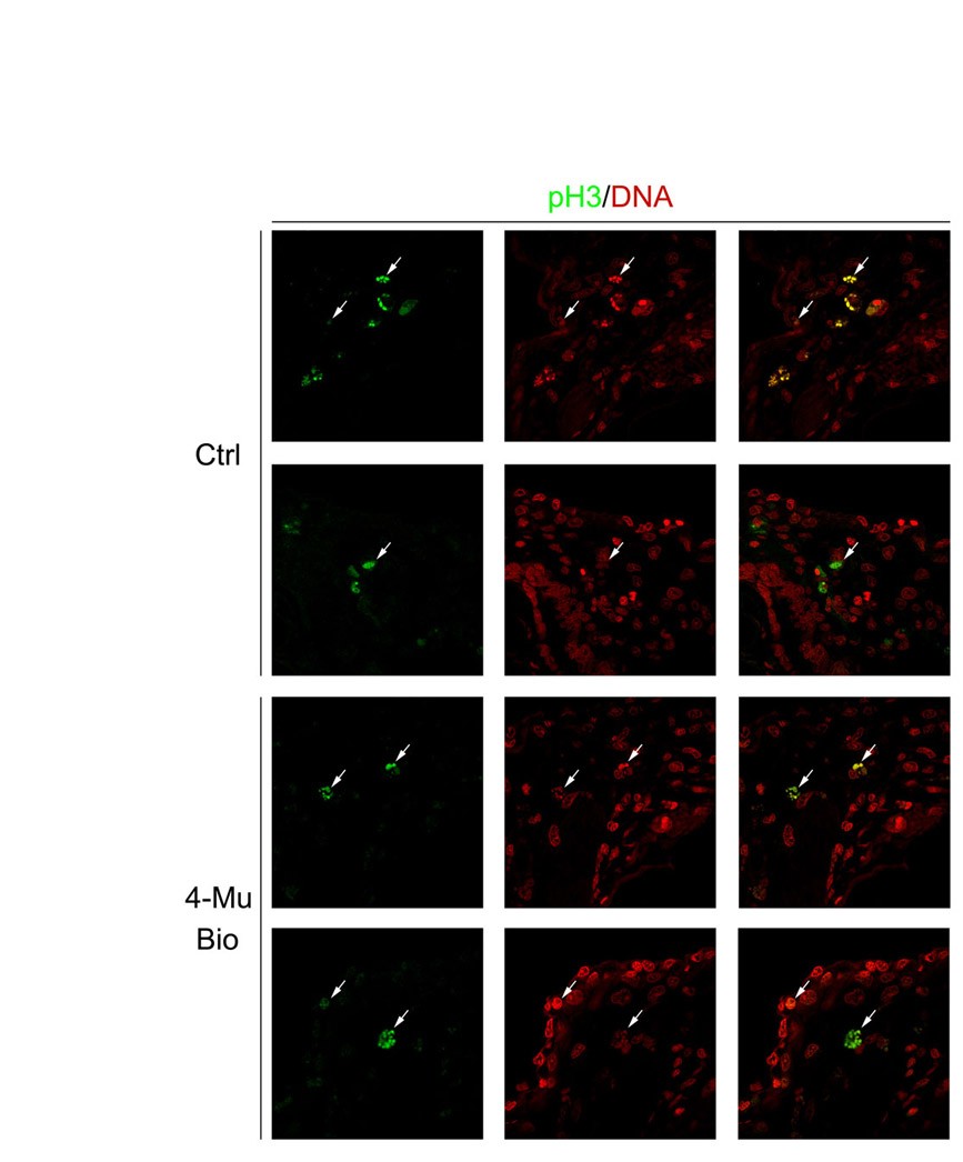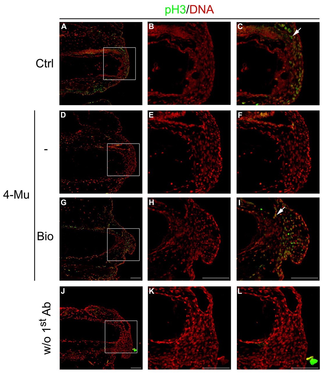 Fig. 5. HA synthesis is required for cell proliferation during tail regeneration. (A-I) Tadpoles at stage 48/50 were amputated and received no treatment (A-C) or were incubated during the first 24 hours with 150 μM 4-Mu (D-F) or 4-Mu during 24 hpa and 200 nM BIO during 48 hpa (G-I). (J-L) Tails were developed by immunohistochemistry in the absence of anti-pH3 antibody. Panels B, E, H and K show only the red channel and C, F I and L the merge of green and red channels from magnifications of the areas framed in panels A, D, G and J. Arrows indicate pH3 staining in cells lining the spinal cord ampulla. Scale bar: 50 μm. |