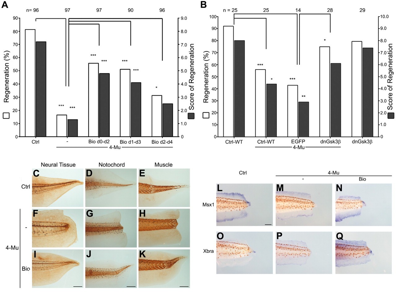 Fig. 6. Inhibition of GSK3β is sufficient to rescue tail regeneration in the presence of 4-Mu. (A) BIO could rescue tail regeneration when HAS activity was inhibited. White bars, percentage of regeneration; black bars, score of regeneration. The numbers on top of each bar correspond to the number of tadpoles analyzed for each experimental point. The results shown are the average of three experiments in different frog batches. (B) HS-dnGSK3β and HS-EGFP F0 transgenic tadpoles were prepared. Tadpoles were heat shocked 16 hours before amputation and 8 and 24 hpa. When indicated tadpoles were incubated with 100 μM 4-Mu during the first 24 hpa and then tails allowed to regenerate for 6 days and the efficiency of regeneration quantitated. *P<0.05; **P<0.01; ***P<0.001. (C-K) Immunohistochemical analysis of regenerated tails. Stage 41/42 tadpoles were amputated and received no treatment (C-E) or incubation with (F-H) 4-Mu during the first 24 hpa or (I-K) 4-Mu during the first 24 hpa and BIO during the first 2 dpa. Tails were allowed to regenerate, fixed at 6 dpa and developed by immunohistochemistry using antibodies against spinal cord (acetylated tubulin) (C,F,I), notochord (MZ15) (D,G,J) and muscle (E,H,K) (12/101). Five to eleven tails were analyzed for each experimental point. Scale bars: 200 μm. (L-Q) Rescue of molecular markers with BIO. Stage 41/42 tadpoles were amputated and received no treatment (L,O) or were incubated with 4-Mu (M,P) or 4-Mu and BIO (N,Q). Tails regenerate until 2 dpa and Msx1 (L-N) or Xbra (O-Q) were detected by in situ hybridization. Scale bars: 500 μm. |