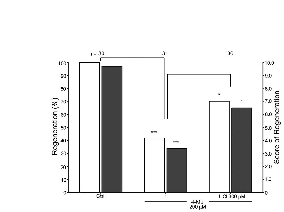 Fig. S4. LiCl is sufficient to rescue diminished tail regeneration in the presence of 4-Mu. Stage 41/42 tadpoles were amputated and incubated with 4-Mu and LiCl for the first 24 and 48 hpa, respectively. After the chemicals were removed, tails were allowed to regenerate for a period of 4 more days. White bars (percentage of regeneration) and black bars (score of regeneration). The numbers on top of each bar correspond to the amount of tadpoles analyzed for each experimental point. The results shown are representative of three experiments in different frog batches. |