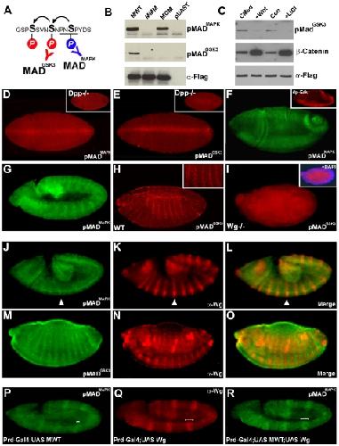 Figure 3. Phospho-Specific Antibodies Reveal Wg-regulated Segmental Expression Patterns of pMadMAPK and pMadGSK3.(A and B) Western blot analysis of pMadMAPK and pMadGSK3 antibodies demonstrating that they were phospho-specific, and that GSK3 phosphorylation had an absolute requirement for MAPK priming. Drosophila S2 cells were transiently transfected with the plasmids indicated. (C) Cultured 293T cells stably transfected with Mad-Flag treated with L-cell control conditioned medium (CMed), Wnt3a medium, control DMEM (Con), or 30 mM LiCl in DMEM for 2 hours. Wnt3a and LiCl inhibited the MadGSK3 phosphorylation band and increased β-Catenin levels (indicating that the Wnt treatment was effective). (D and E) pMadMAPK and pMadGSK3 antibodies stain the entire blastoderm and a Dpp-dependent dorsal stripe (inset). (F) pMadMAPK tracks ventral EGFR-activated MAPK (inset shows diphospho-Erk staining). (G and H) Segmental staining of pMadMAPK (Stage 9) and pMadGSK3 (Stage 17). (I) In Wg null mutants segmental expression is lost. Mutant embryos were identified by lack of staining with Wg antibody. Inset shows same embryo stained with DAPI to indicate that, despite its abnormal shape, it reached late stages of development. (JâL) Wg stabilizes pMadMAPK, overlapping with Wg stripes. (MâO) Nuclear pMadGSK3 accumulates in between Wg stripes, indicating that Wg inhibits Mad phosphorylation at GSK3 sites in vivo. (PâR) Wg overexpression driven with prd-Gal4 stabilizes pMadMAPK over a broader domain compared to just MWT alone (compare brackets in P and R). This experiment shows that Wg expression stabilizes pMADMAPK. |