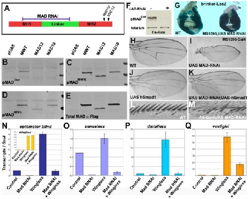Figure 4. Mad10 and Mad12 Alleles Are not Nulls; Mad RNAi Is an Effective and Specific Loss-of-Function Reagent.A) Schematic representation of Mad, showing RNAi and mutant sites. (B–E) Mad10 and Mad12 mutants are phosphorylated in the linker region in the absence of C-terminal phosphorylation. (F) UAS-Mad RNAi depleted stage 15 embryos of endogenous pMadCter when driven by daughterless-Gal4. (G) Repression of brinker-LacZ reporter by Dpp (demarcated by hatched lines) was inhibited by Mad RNAi in wing imaginal discs. (H–K) Mad RNAi driven by MS1096-Gal4 causes complete vein loss at room temperature, which was rescued by UAS-hSmad1. (L and M) Anterior margin mechanosensory bristles are lost when two copies of Mad RNAi were driven with A9-Gal4; this phenocopies Wg loss-of-function. (N–Q) Epistasis by QRT-PCR showing that Wg overexpression in the wing pouch, driven by sd-Gal4, increased transcript levels of the reporter genes optomotor blind, senseless, distalless and vestigial, and that this induction required Mad Samples were normalized for Gal4 mRNA levels Inset shows that levels of Wg transcripts were not affected by Mad RNAi. |